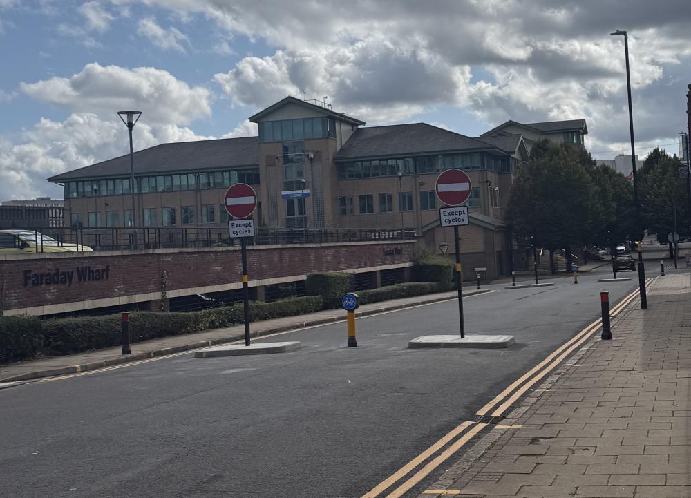 The experimental modal filter at the junction of Holt Street and Lister Street, in Birmingham city centre.