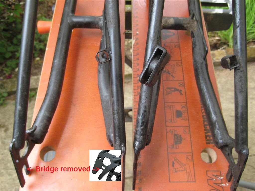 The more minor difference are small metal bridges in the rear fork of the new triangle. These are easily removed with a junior hacksaw. The more major difference is the new frame only has one braze-on for a gear pulley block (these slide into the braze-on and are secured with a threaded metal ring where the Bowden cable enters the block). The required additional braze-on is very carefully removed from the old frame using a rotary tool such as a Dremel.