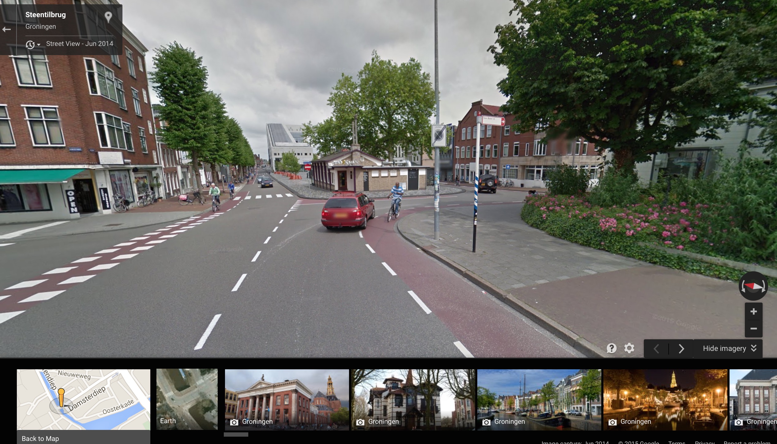 This modern cycle lane has been badly designed, and encourages motor vehicles to over-run the corner. Although this image comes from Google Streetview, on David Hembrow's study tour in June 2014, Push Bikes members cycled this road, and saw motor vehicles cutting the corner in the same way.