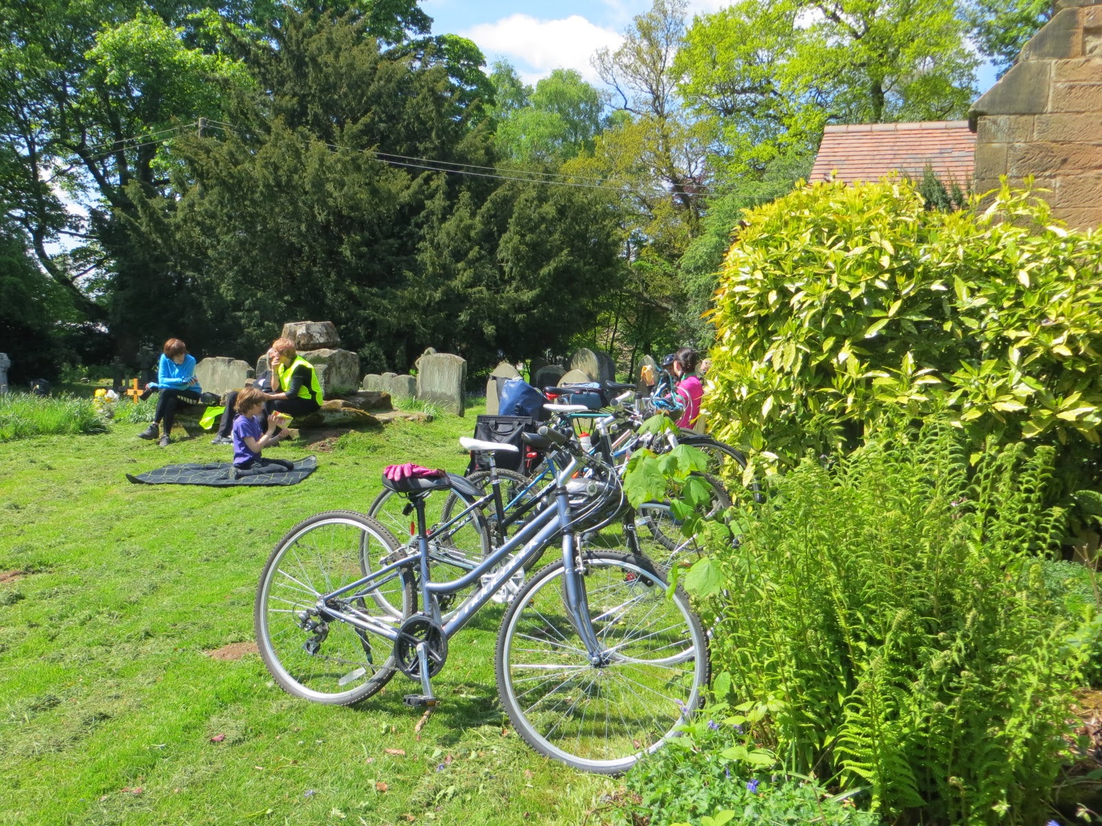Bournville Gentle Cycling participants take a rest in Cofton churchyard.