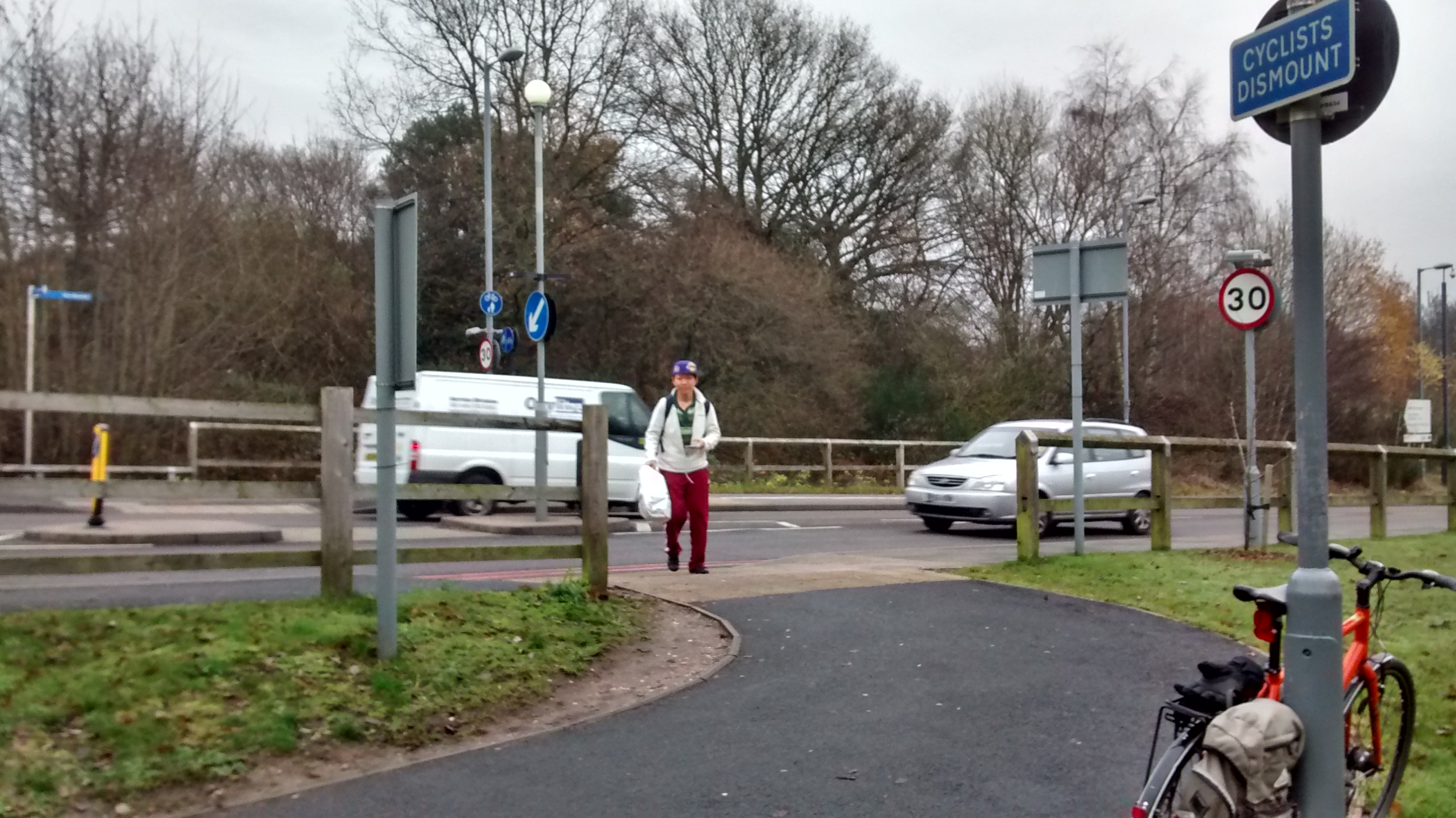 The patchy design of the infrastructure at the Queen Elizabeth hospital means that cyclists are asked to dismount to cross the carriageway, even though that will expose them to danger for longer. The island in the middle is not wide enough for a bike.