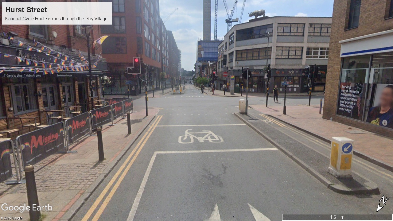 National Cycle Route 5 runs through the Gay Village. Image © 2025 Google.